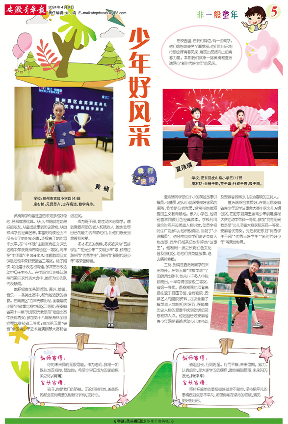《安徽青年报·学生周刊》励志启智,开阔视野,净化心灵,陶冶情操,参与互动,集新闻性、知识性、趣味性、互动性为一体,是小学生成长的良师益友、参与互动的平台、沟通老师家长的纽带。