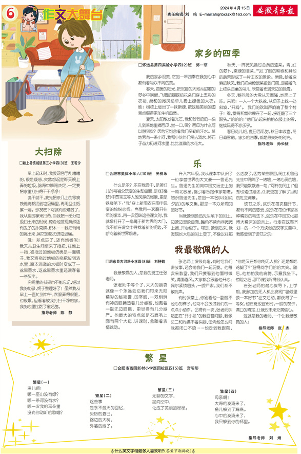 《安徽青年报·学生周刊》励志启智,开阔视野,净化心灵,陶冶情操,参与互动,集新闻性、知识性、趣味性、互动性为一体,是小学生成长的良师益友、参与互动的平台、沟通老师家长的纽带。