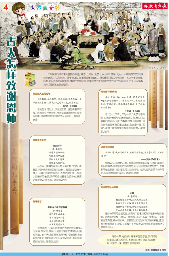 《安徽青年报·学生周刊》励志启智,开阔视野,净化心灵,陶冶情操,参与互动,集新闻性、知识性、趣味性、互动性为一体,是小学生成长的良师益友、参与互动的平台、沟通老师家长的纽带。