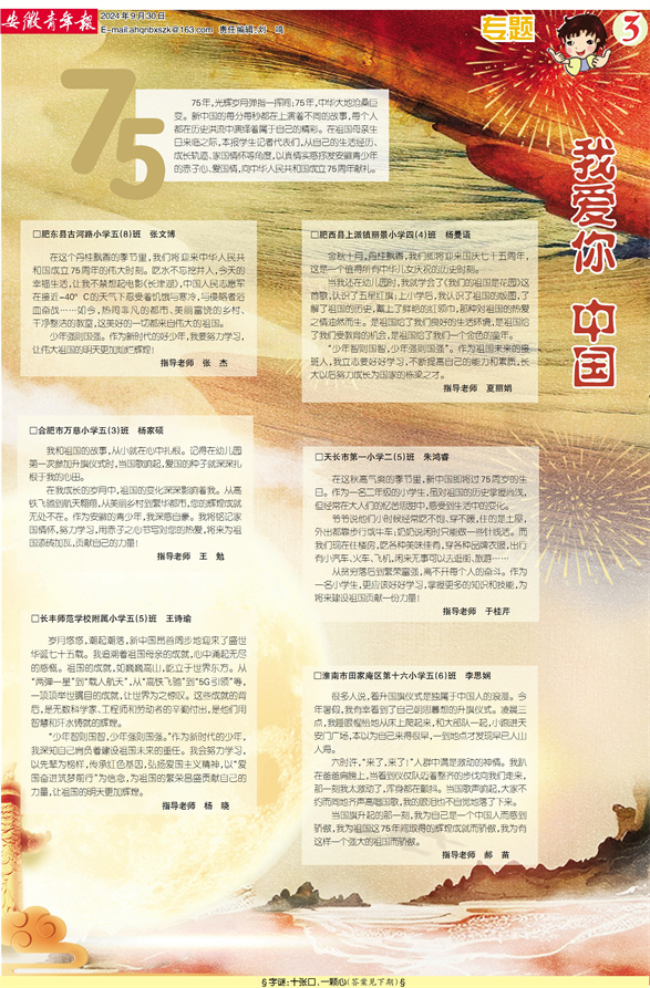 《安徽青年报·学生周刊》励志启智,开阔视野,净化心灵,陶冶情操,参与互动,集新闻性、知识性、趣味性、互动性为一体,是小学生成长的良师益友、参与互动的平台、沟通老师家长的纽带。