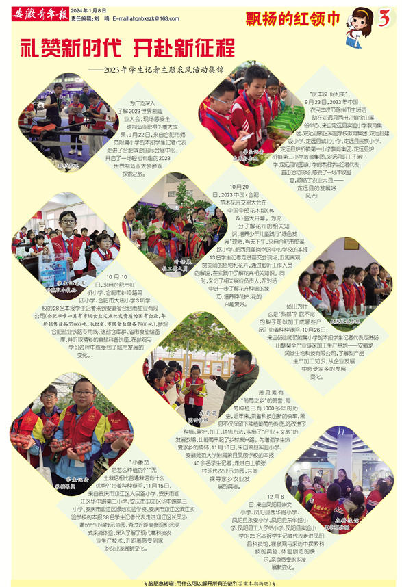 12月6日,来自凤阳县崇文小学、凤阳县西华路小学、凤阳县永安小学、凤阳县东华路小学、凤阳县工人子弟小学、凤阳县实验小学的25名本报学生记者代表走进凤阳县科技馆,在参观与采访中探索科技的奥秘,体验创造的快乐,亲身感受家乡发展新变化。