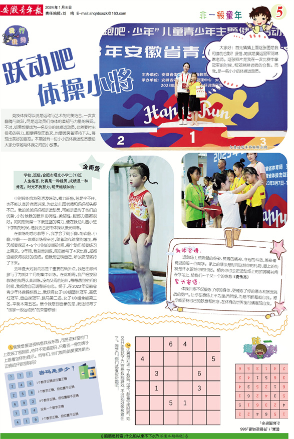 去年夏天对我而言是个重要的转折点,我赶往滁州参与了为期2个月的集中训练。在此期间,我严格按照教练的指导认真训练,没有父母的陪伴,每每遇到挫折的时候,我都会自己调整好心态。终于,在2023年安徽省青少年体操锦标赛上,我获得女子U8组团体冠军、高低杠冠军、自由操冠军、跳马第二名、女子U8组全能第三名、平衡木第五名。最令我感到自豪的是,我还取得了“国家一级运动员”的荣誉称号!