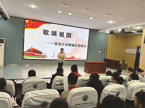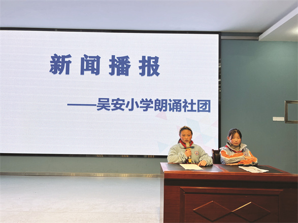 朗朗有声 “语”众不同 □小 J 魅力社团 蚌埠市吴安小学朗诵社团 “刚开始学朗诵的时候,我连‘的、地、得’都分不清,但经过一个学期的努力,现在的我不仅读得准确,还朗诵得非常有情感……”这是四年级张智鑫同学在参加了朗诵社团后的感受。据了解,蚌埠市吴安小学朗诵社团自开展以后,就受到同学们的喜欢,每周四延时课上,同学们早早就来到教室。 据了解,朗诵社团每节课由老师根据专业朗诵教材,带领同学们进行口腔操以及朗诵主持手势舞练习。在掌握了基础知识后,还在每节课开展新闻播报环节,同学们可以上台展示和朗诵,其他学生听、学、共评。“很开心能参与朗诵社团,尤其是社团开始了新闻播报这一环节后,我第一次感受到当新闻播报员的紧张与激动,也让我更加期待每一次的社团课了!”五(2)班吴润松开心地说。 通过学习,同学们由一开始不敢登台,到现在的期待上台表演,热情度也逐步提高。四(6)班张智鑫就说:“加入朗诵社团,我对朗读的兴趣更大了,现在我不仅喜欢朗读书籍,还喜欢展示自己,胆量越来越大!” “朗诵社团课的开展不仅帮助小学生养成了良好的礼仪习惯,最关键的是,可以更好地提升学生的语文素养。”校长吴瑰介绍说, “学校今后会通过朗诵活动的开展,让学生接受中华文化熏陶,养成良好的阅读习惯,从而推动书香校园的建设。”