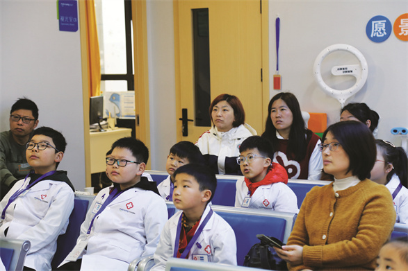 成为“小医生”的第一步,当然是要有足够的理论知识储备。在现场工作人员的带领下,学生记者们排着队有序走进艾尔兴眼科的大厅。视光师刘叔叔已经在这里等候大家,为大家带来一场生动有趣的眼科知识科普。“小朋友们,你们知道近视眼是什么感觉吗?近视眼又是怎么形成的呢……”从近视眼的形成到远视储备的概念,从专业措施到日常生活习惯,刘叔叔细致地向学生记者们介绍了视力健康知识和保护视力的做法。“要坚持‘一拳一尺一寸’和三个‘20’原则,合理安排睡眠和饮食,远离电子产品……”学生记者李文博认真复盘着刚刚听到的护眼知识。