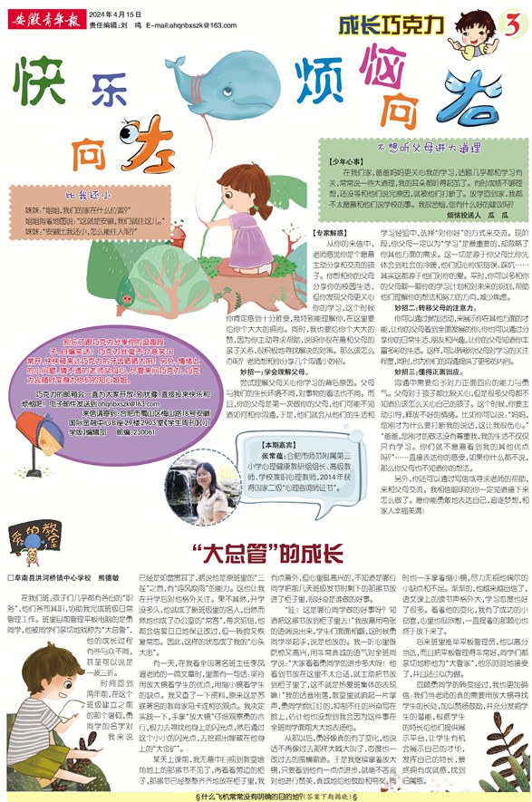 张常蕴:合肥市师范附属第三小学心理健康教研组组长、高级教师、学校兼职心理教师,2014年获得国家二级“心理咨询师证书”。