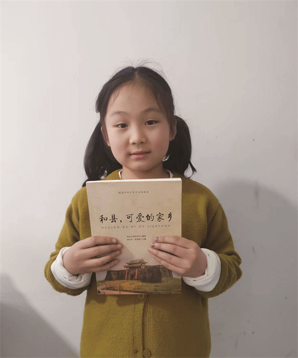 书中最优美的是名胜篇,如方山、鸡笼山、西梁山,座座风景如画;最有趣的是民俗篇,家乡的歇后语和谚语,用家乡话读起来,笑得人合不拢嘴……我最爱读的是关于“和县猿人”的介绍,在我的央求下,爸爸妈妈带着我来到了善厚镇陶店村的龙潭洞,遥遥看着洞口,想象着祖先们在这里生活劳作的情景,我自豪极了。