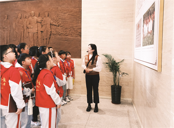 活动当天,学生记者一行满怀敬意地瞻仰了纪念馆正门前的毛主席全身铜像,随后,在讲解员孔德云的带领下,有序参观了纪念馆,馆内收藏了大量毛主席视察舒茶时的照片、文献资料,毛主席坐过的椅子、用过的茶杯以及人民公社时期的生产生活器具等实物,这些资料和实物不知不觉将学生记者们的思绪引入那似火年代的红色记忆中。“站在伟人来过的地方,看着伟人用过的物品,我的内心特别激动。”学生记者倪徽男说。