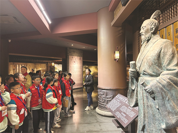 活动的第二站,学生记者一行来到了位于颍上县江心洲九合塔一楼的管子文化园,该园也是阜阳市爱国主义教育示范基地。园内展示的是以管仲生平为脉络的大型彩色雕塑群,在讲解员的带领下,学生记者参观学习了从管仲抓周、管仲拜相,到管仲辅佐齐桓公九合诸侯,一匡天下,完成春秋霸业,促进国家统一的丰功伟业的全过程,也明白了保护好、传承好、挖掘好、弘扬好管子文化的重要性以及必要性。