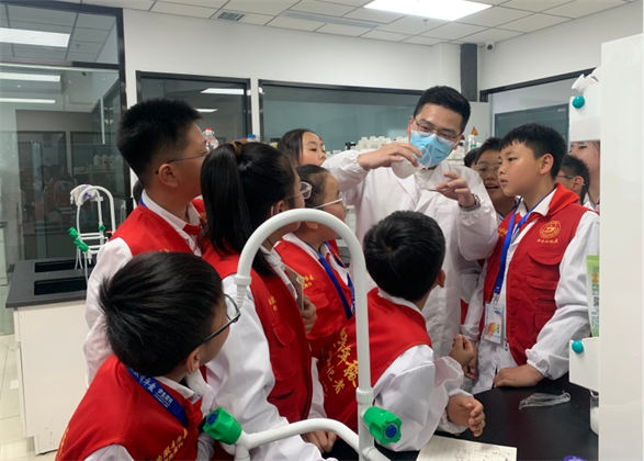参观结束,就到了学生记者们最期待的科学小实验环节。大健康产品研发技术员谢杨叔叔向大家详细地介绍了操作台上所展示的玻璃瓶、试管、塑料滴管、盐酸溶液、氢氧化钠溶液等实验用品,同时现场演示了它们的不同用法,学生记者们在学习了实验器材的使用方法后,便开始了具体的实验操作。