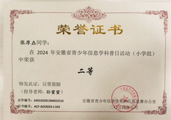 接触了计算机后,我发现自己非常喜欢信息学、人工智能等。经过一年多时间的学习,在校内外老师的精心培养与引领下,五年级时我先后参加了庐阳区级、合肥市级、安徽省级信息学科普日活动以及全国青少年科技教育成果展示大赛、全国青少年信息素养大赛等多项比赛,并屡获佳绩。