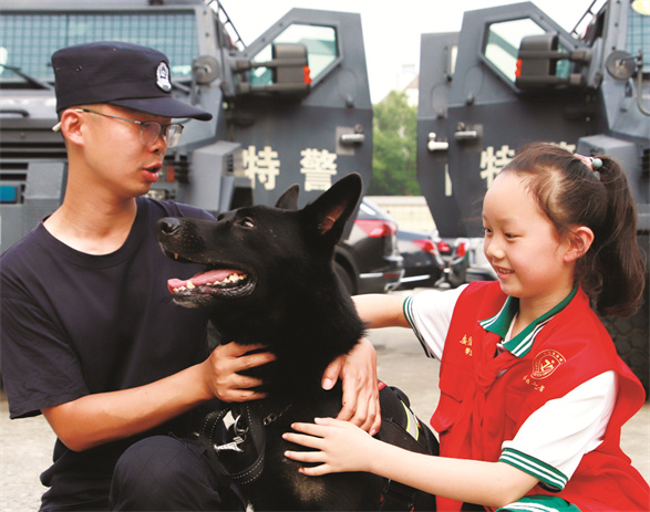互动问答后,警犬训导员还给学生记者们展示了警犬训练日常,并在确保安全的前提下,邀请大家与警犬合影互动。活动的最后,学生记者们还激动不已地登上了超级炫酷的“装甲突击车”。