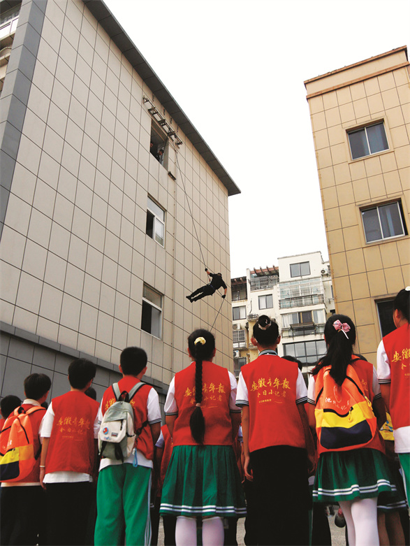 “大家看好,不要眨眼,现在展示的是特警们在出警活动中经常用到的‘索降’(索降是一种特种技能,一般从高处利用专用绳索降落至地面。特种兵和特警等经常使用索降技能),几秒钟的时间就可以从几层楼高速降到地面。”活动的第一站,特警叔叔们首先就为学生记者带来了一场精彩纷呈的“空中飞人”技能展示活动。