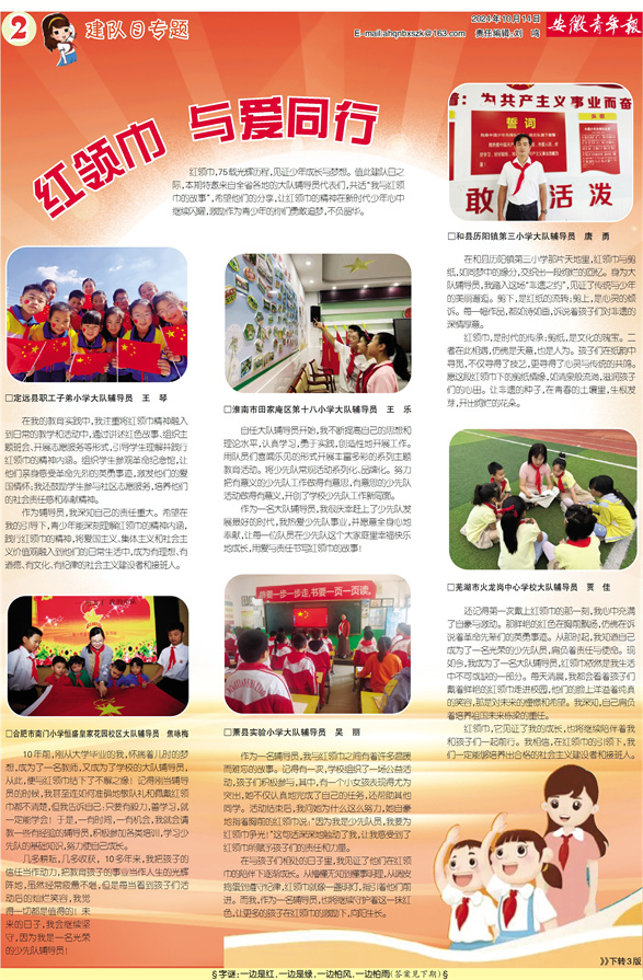 10年前,刚从大学毕业的我,怀揣着儿时的梦想,成为了一名教师,又成为了学校的大队辅导员,从此,便与红领巾结下了不解之缘!记得刚当辅导员的时候,我甚至连如何准确地敬队礼和佩戴红领巾都不清楚,但我告诉自己:只要有毅力,善学习,就一定能学会!于是,一有时间,一有机会,我就会请教一些有经验的辅导员,积极参加各类培训,学习少先队的基础知识,努力使自己成长。