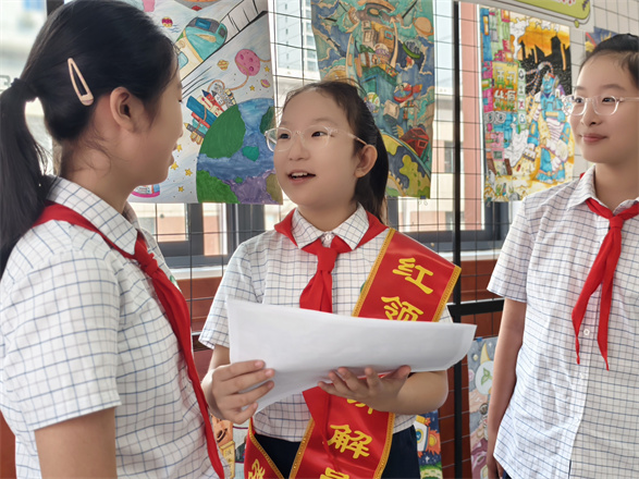 之前我是学校红领巾广播站的小小播音员,这学期我又加入了学校红领巾讲解团,成为一名光荣的讲解员。当我第一次将自己对武王墩的了解分享出来时,我看到了小伙伴们脸上洋溢的笑容和眼中闪烁的渴望。这一刻,我感觉我胸前的红领巾更鲜艳了,我为自己是一名红领巾讲解员而自豪。同时,我用声音和热爱,让家乡的故事穿越时空,感染到更多幼小的心灵。