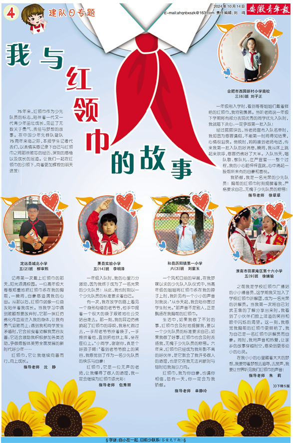75年来,红领巾作为少先队员的标志,陪伴着一代又一代青少年茁壮成长,见证了无数关于勇气、责任与梦想的故事。在中国少年先锋队建队75周年来临之际,本报学生记者代表们,以真情实感记录下自己与红领巾之间那些难忘的经历、深刻的感悟以及成长的足迹。让我们一起在红领巾的引领下,向着更加辉煌的明天进发!