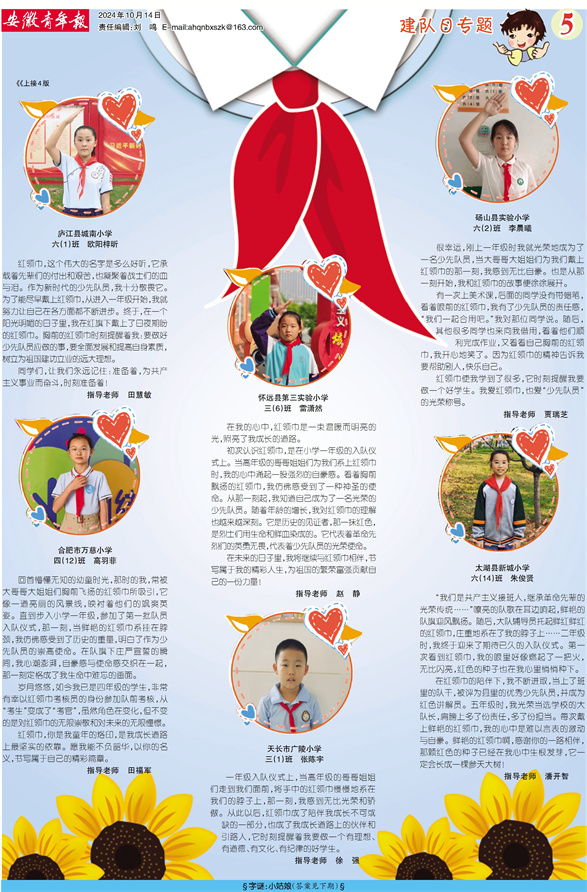 岁月悠悠,如今我已是四年级的学生,非常有幸以红领巾考核员的身份参加队前考核,从“考生”变成了“考官”,虽然角色在变化,但不变的是对红领巾的无限崇敬和对未来的无限憧憬。