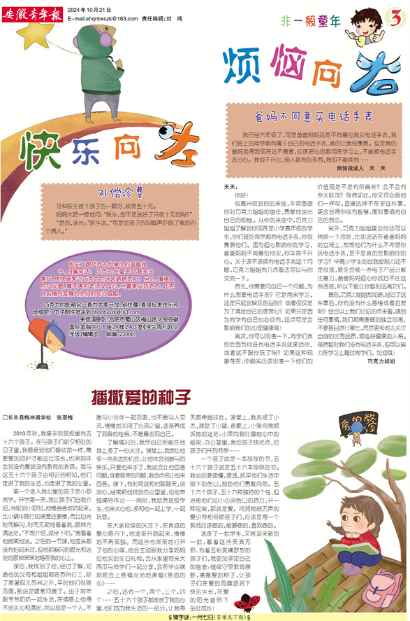 很高兴收到你的来信,非常感谢你对巧克力姐姐的信任,勇敢地说出自己的烦恼。从你的来信中,巧克力姐姐了解到你现在是小学高年级的学生,你们班的同学都有电话手表,你很羡慕他们。因为担心影响你的学习,爸爸妈妈不同意给你买,你非常不开心。关于该不该拥有电话手表这个问题,巧克力姐姐有几点看法可以与你交流一下。