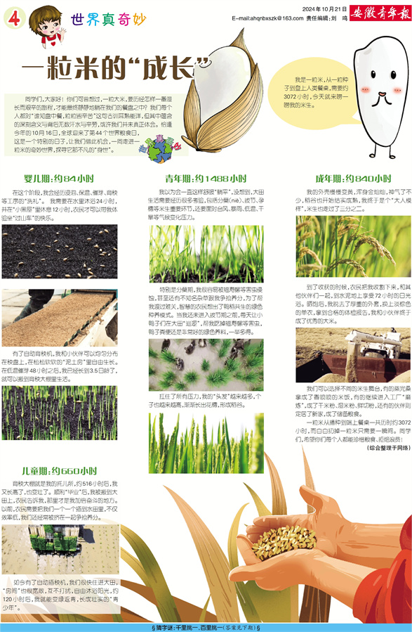 我们可以选择不同的米生舞台,有的蒸完桑拿成了香喷喷的米饭,有的继续进入工厂“磨炼”,成了干米粉、湿米粉、鲜切粉,还有的伙伴则定居了新家,成了储备粮食。 一粒米从播种到端上餐桌一共历时约3072小时,而白白扔掉一粒米只需要一瞬间。同学们,希望你们每个人都能珍惜粮食、拒绝浪费! |