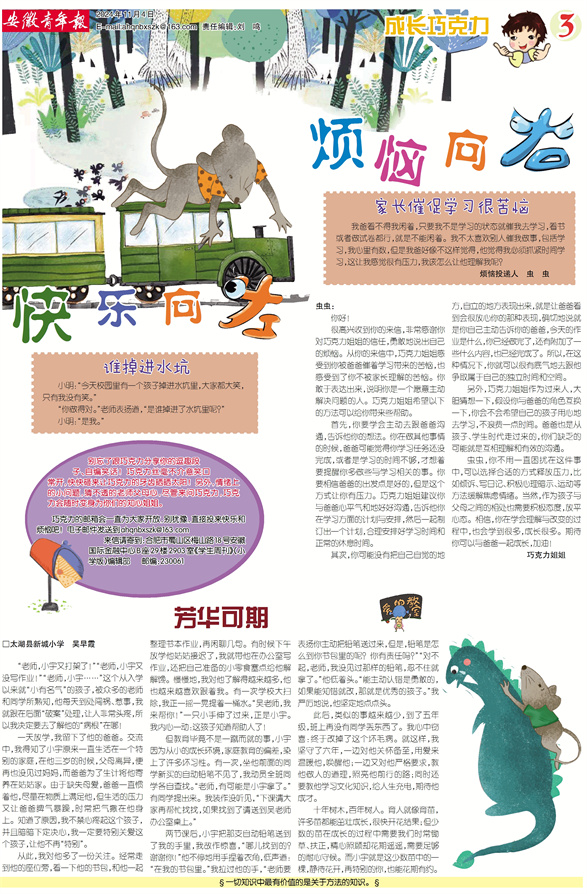 此后,类似的事越来越少,到了五年级,班上再没有同学丢东西了。我心中窃喜:终于改掉了这个坏毛病。就这样,我坚守了六年,一边对他关怀备至,用爱来温暖他,唤醒他;一边又对他严格要求,教他做人的道理,照亮他前行的路;同时还要教他学习文化知识,给人生充电,期待他成才。