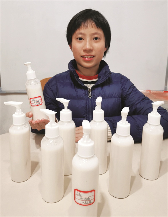 “这个项目实施过程中,最大的困难就是面粉水的分层问题。面粉洗洁精配制好后,一般24小时内就会出现分层的现象。为了解决这个问题,我尝试了很多办法,请教了老师。最后,在老师的帮助下,我通过查阅资料,参考市售洗洁精的配方,参考酸奶、果冻的配方,最终通过反复实验,解决了这个问题。为了调配好各种材料添加的比例,我前后反复实验了小半年,才筛选出一个最佳配比,最终研制出现在这款‘可以吃的’洗洁精。”