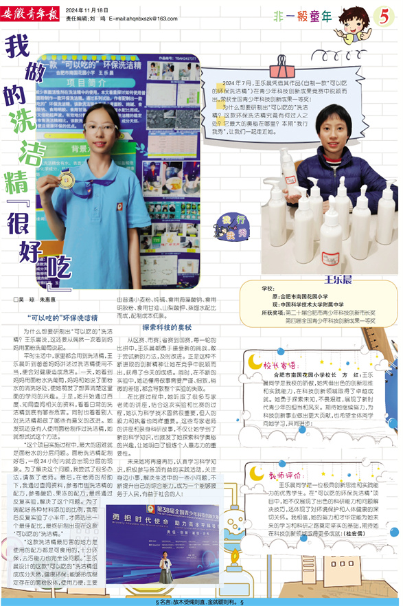 2024年7月,王乐晨凭借其作品《自制一款“可以吃的环保洗洁精”》在青少年科技创新成果竞赛中脱颖而出,荣获全国青少年科技创新成果一等奖!