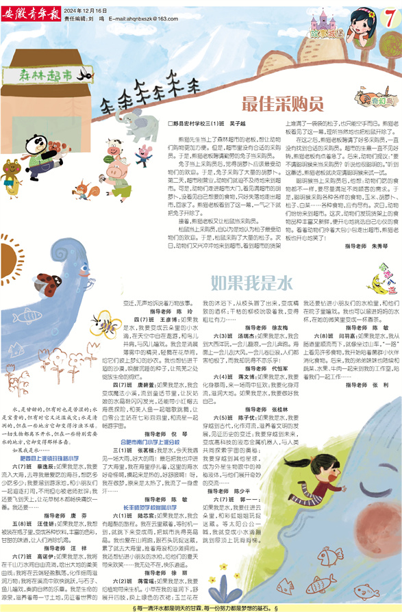 胡说八道 如果我是水 水,是甘甜的,但有时也是苦涩的;水是宝贵的,但有时它又泛滥成灾;水是清冽的,但在一些地方它却变得污浊不堪。一切生物都离不开水,但在一些特别需要水的地方,它却变得那样吝啬。 如果我是水…… 肥西县上派镇珍珠路小学 六(7)班 蔡逸辰:如果我是水,我要流入大海,去寻我最爱吃的海苔,想吃多少吃多少;我要溜到游泳池,和小朋友们一起追逐打闹,不用担心被老师批评;我还要飞到天上,让花草树木都畅快痛饮一番。我还要…… 指导老师 唐 芬 五(8)班 汪佳妍:如果我是水,我想被装在瓶子里,变成各种饮料,丰富的色彩,甘甜的味道,让人们消除饥渴。 指导老师 汪 祥 六(7)班 高诺伊:如果我是水,我将在千山万水间自由流淌,绘出大地的柔美曲线;我将在云端轻盈飘荡,化作细雨滋润万物;我将在溪流中欢快跳跃,与石子、鱼儿嬉戏,奏响自然的乐章。我是生命的源泉,滋养着每一寸土地,见证着世界的变迁,无声地诉说着万物故事。 指导老师 陈 玲 四(7)班 王彦博:如果我是水,我要变成云朵里的小水滴,在天空中自在遨游,和鸟儿并肩,与风儿嬉戏。我会是清晨薄雾中的精灵,轻舞在花草间,给它们披上梦幻的纱衣。我也想钻进干涸的沙漠,唤醒沉睡的种子,让荒芜之处绽放生命的绚烂。 四(7)班 唐碧萱:如果我是水,我会变成魔法小溪,流到童话书里,让灰姑娘的水晶鞋闪闪发光,还能带小红帽去海底探险,和美人鱼一起唱歌跳舞,让白雪公主站在七彩泡泡里,和流星一起畅游宇宙。 指导老师 倪 琴 合肥市南门小学上派分校 三(1)班 张茗楦:我是水,今天我遇见一场大雨,好大的雨!最后把我也冲进了大海里,我在海里挣扎着,这里的海水好奇怪啊,摸起来是热的,好舒服啊!呀,我在做梦,原来是太热了,我流了一身虚汗…… 指导老师 陈 敏 长丰师范学校附属小学 六(1)班 陆芯宸:如果我是水,我会有超酷的旅程。我在云里藏着,等时机一到,就跳下来变成雨,把城市洗得亮晶晶。我也爱在山间跑,跟石头玩捉迷藏,累了就去大海里,推着海浪和沙滩拥抱。我还想钻进小朋友的水枪,给他们的夏天带来欢笑……我无处不在,快乐逍遥。 指导老师 徐 丽 六(2)班 蒋雪瑶:如果我是水,我要给植物带来生机。小草在我的滋润下,舒展开四肢,换上绿色的衣裙;玉兰花在我的沐浴下,从枝头冒了出来,变成精致的酒杯;干枯的柳枝吮吸着我,变得粗壮有力…… 指导老师 徐友梅 六(3)班 汤瑞杰:如果我是水,我会到大西洋玩,一会儿翻滚,一会儿奔跑。海面上一会儿刮大风,一会儿卷巨浪,人们都害怕极了,而我却玩得不亦乐乎! 指导老师 代恒军 六(4)班 蒋文博:如果我是水,我要化身暴雨,来一场雨中狂欢;我要化身河流,滋润大地。如果我是水,我要做好我自己。 指导老师 张桂林 六(5)班 陈子优:如果我是水,我要穿越到古代,化作河流,滋养着文明的发展,见证历史的变迁;我要穿越到未来,变成高科技的液态金属机器人,与人类共同探索宇宙的奥秘;我要穿越到其他星球,成为外星生物眼中的神秘液体,与他们展开奇妙的交流…… 指导老师 陈少平 六(7)班 郭一一:如果我是水,我要住进云朵里,和彩虹姐姐玩捉迷藏。等太阳公公一喊,我就变成小水滴蹦跳到屋顶上玩滑滑梯。我还要钻进小朋友们的水枪里,和他们在院子里嬉戏。我也可以溜进妈妈的水杯,在她的微笑里变成一杯香茶。 指导老师 陈 敏 六(8)班 闫羽嘉:如果我是水,我从肠道里顺流而下,就像坐过山车,“一路”上看见许多食物,我开始陪着菌群小伙伴消化食物。后来,我的弟弟妹妹也陆续和蔬菜、水果、牛肉一起来到我的工作室,陪着我们一起工作…… 指导老师 张 利