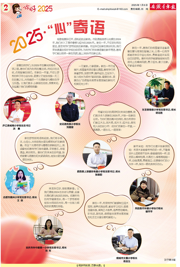 带着对知识的渴望和对未来的憧憬,我们携手步入崭新的2025年,开始一段新的征程。为你们感到高兴的同时,我也希望你们能立大志,明大德,成大才,担大任,做党和人民的好少年!祝你们在新的一年里,一路高歌,一路生花,一路璀璨!