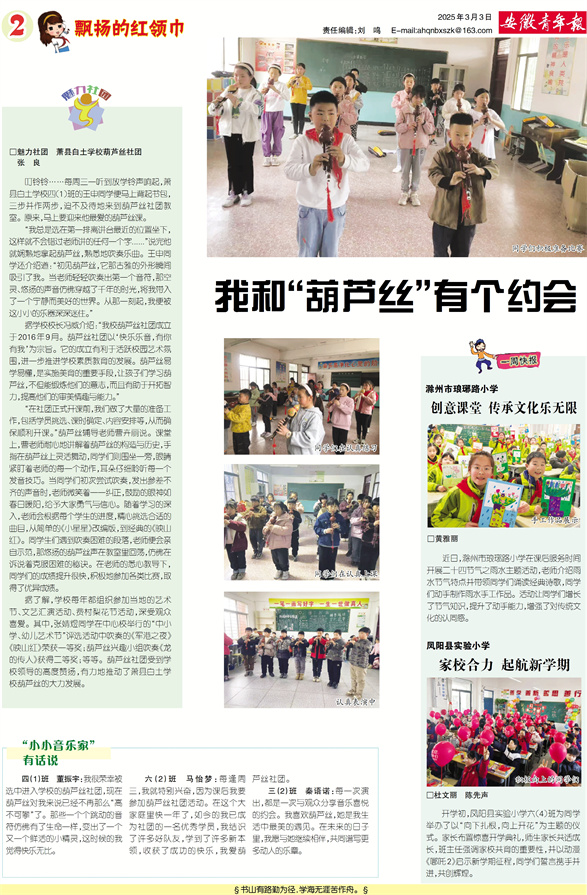 叮铃铃……每周三一听到放学铃声响起,萧县白土学校四(1)班的王申同学便马上背起书包,三步并作两步,迫不及待地来到葫芦丝社团教室。原来,马上要迎来他最爱的葫芦丝课。
