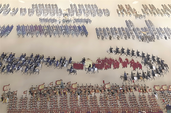 隋唐时代国力强盛,开疆拓土不断,阅兵制度空前完善,并被纳入国家法典。据史料记载,隋炀帝大业八年征讨高丽前,曾在涿郡举行规模宏大的阅兵,军队首尾相接九百余里,气势震撼。唐代在《开元礼》中对阅兵礼作出细致规定,阅武的过程也大致分为:择定场地、采选人员、编排组次、总指挥与各阵军官宜讲督言、步军演阵、骑军演阵、比武技击、奖赏士卒。