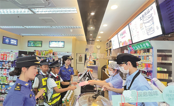 培训后,学生记者们就迫不及待穿上了迷你城管马甲,在工作人员的带领下正式“上岗”了。第一个任务就是给商铺派发“门前三包”温馨提醒单。“门前三包”就是要求商铺负责好自家门前的卫生、绿化和秩序。学生记者们拿着提醒单,一家一家商铺地走访,耐心地解释“门前三包”的重要性,还帮忙商户把商铺外的物品搬进店里,受到店员的连连夸赞。
