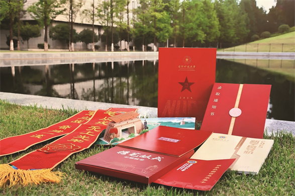 国防科大今年的录取通知书继续采取璀璨红金套盒,打开套盒,惊喜一个接着一个。录取通知书封套采用中央对开设计,犹如打开一扇荣耀大门。除通知书外,“高地印象”立体书以手绘带着你“云游”校园。通过被装数据采集卡扫描提交身体数据,新学员们就能在入列首日穿上适体军装。