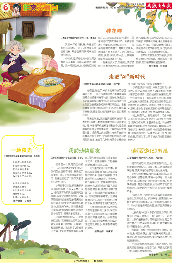 桂花糕 □太湖县牛镇镇严姜小学六(1)班 潘昊宸 又是一年桂花飘香,外婆家门前的桂花树又开花了,我捏着手中的桂花糕,熟悉的香气瞬间牵出儿时的回忆。 小时候,这棵桂花树一到秋天就香得钻人鼻腔,连路人都会驻足寻香。我一闻到这味,就知道能吃桂花糕了,立刻变成外婆的“小尾巴”,围着她念叨“要吃桂花糕”。外婆总会放下手里的活,带我去摇桂花——金黄的花瓣如雨落下,落在我们肩头,也装满了树下的筛子。她仔细挑去枝叶,揉面、蒸糕,不一会儿,软糯香甜的桂花糕就端上了桌。 后来我长大了,外婆脸上添了皱纹,桂花树也长得更高,可秋天里那盘热气腾腾的桂花糕从没变过。每次去外婆家,只要桂花开着,桌上准摆着桂花糕。外公说,外婆知道我们要来,凌晨五点就起床摇桂花,说这时的桂花最香,咬一口,甜味能渗到心里。 去年秋天我没去成外婆家,买的桂花糕总少点味道。原来那独一份的甜,是外婆藏在糕里的爱啊。 指导老师 舒芳英