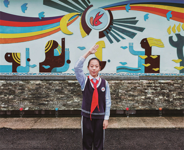 五年来,这抹红时刻激励着我。我看红色影视、读红色故事,创作的《我是中国娃》获市赛二等奖,还走访十棵椿,听老红军讲保家卫国的故事。如今系红领巾已熟练,我仍会认真铺平系正,它陪我长大,未来我会戴着它继续向前。