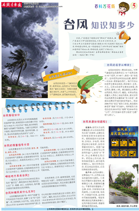 台风的命名有一套国际规则。世界气象组织台风委员会让14个成员国各出10个名字,共140个,做成一张“命名表”。这些名字由各国自由选题,通常是一些友好、易发音的词汇。我们中国出的名字主要来自神话,例如悟空、玉兔、木兰。日本出的名字主要来自星座,例如天鸽、摩羯、小熊。泰国喜欢以水果为台风取名,例如山竹、榴莲。若某台风造成重大人员伤亡或经济损失,受灾国可向台风委员会申请将其“永久除名”,原提供国需次年提交新名字替补。例如2005年的“龙王”被永久除名,我国提供新名字“海葵”作为替补。同样被永久除名的还有2013年的“海燕”和2018年的“山竹”,它们的替补名字分别是“白鹿”和“山陀儿”。